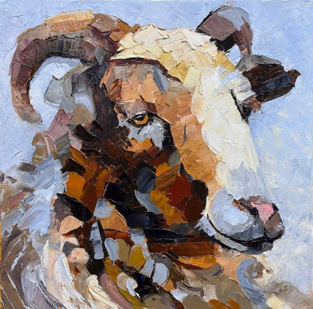 Meet a spirited mountain goat rendered in bold, expressive brushstrokes. With commanding horns and an attitude to match, this painterly piece captures the wild personality of nature's most fearless climber in warm, inviting tones.