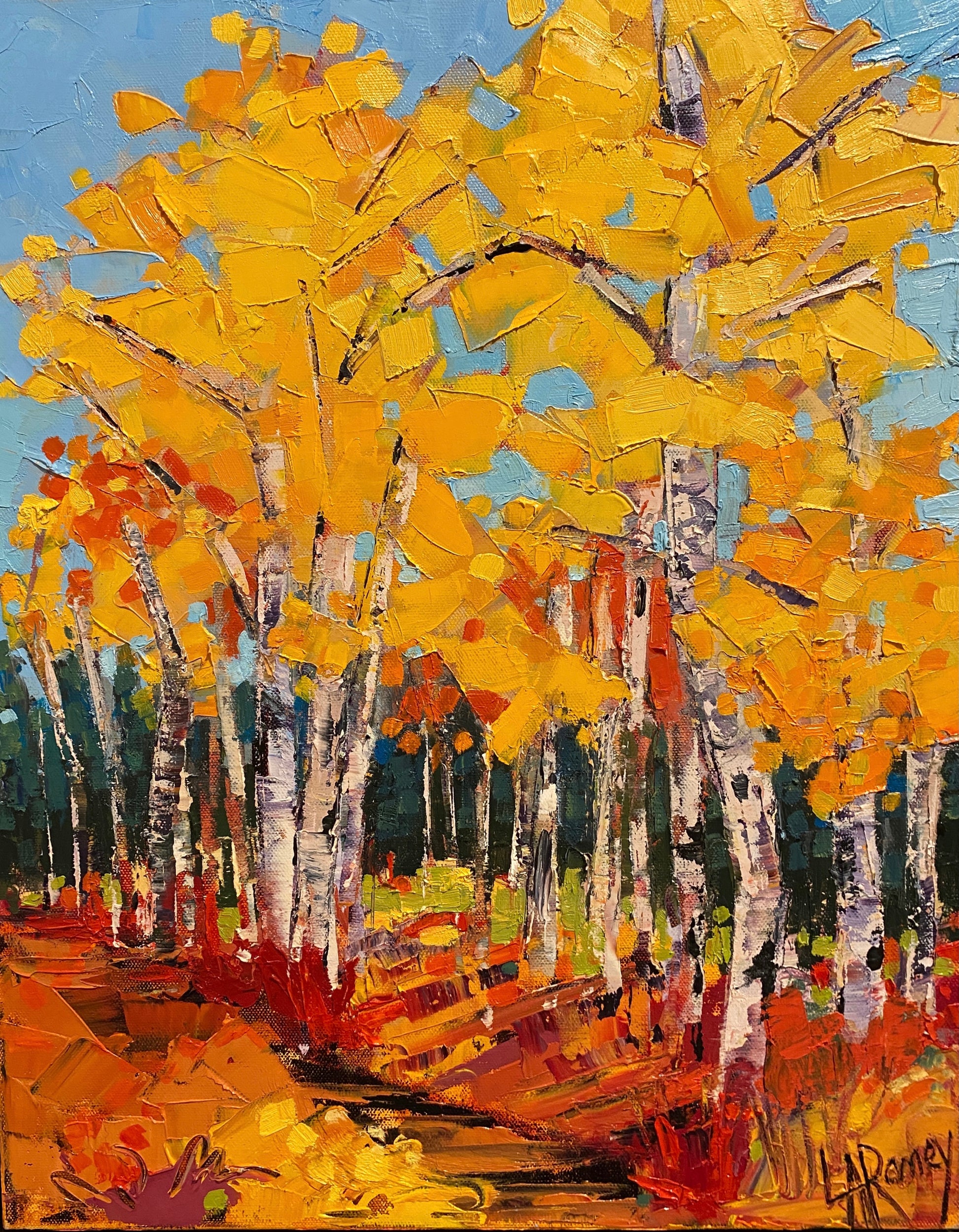 This original 16x20 framed oil painting will bring life and warmth to your walls. Painted with a palette knife and using vibrant colors, this painting features rich texture, bright fall colors, blue skies, and aspen trees that will bring a contemporary feel to any space.