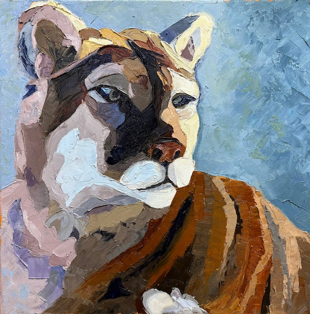A whimsical feline figure emerges from earthy hues in this painterly composition. Warm browns and tans blend together to capture a ghostly mountain lion with artistic charm and delightful character.