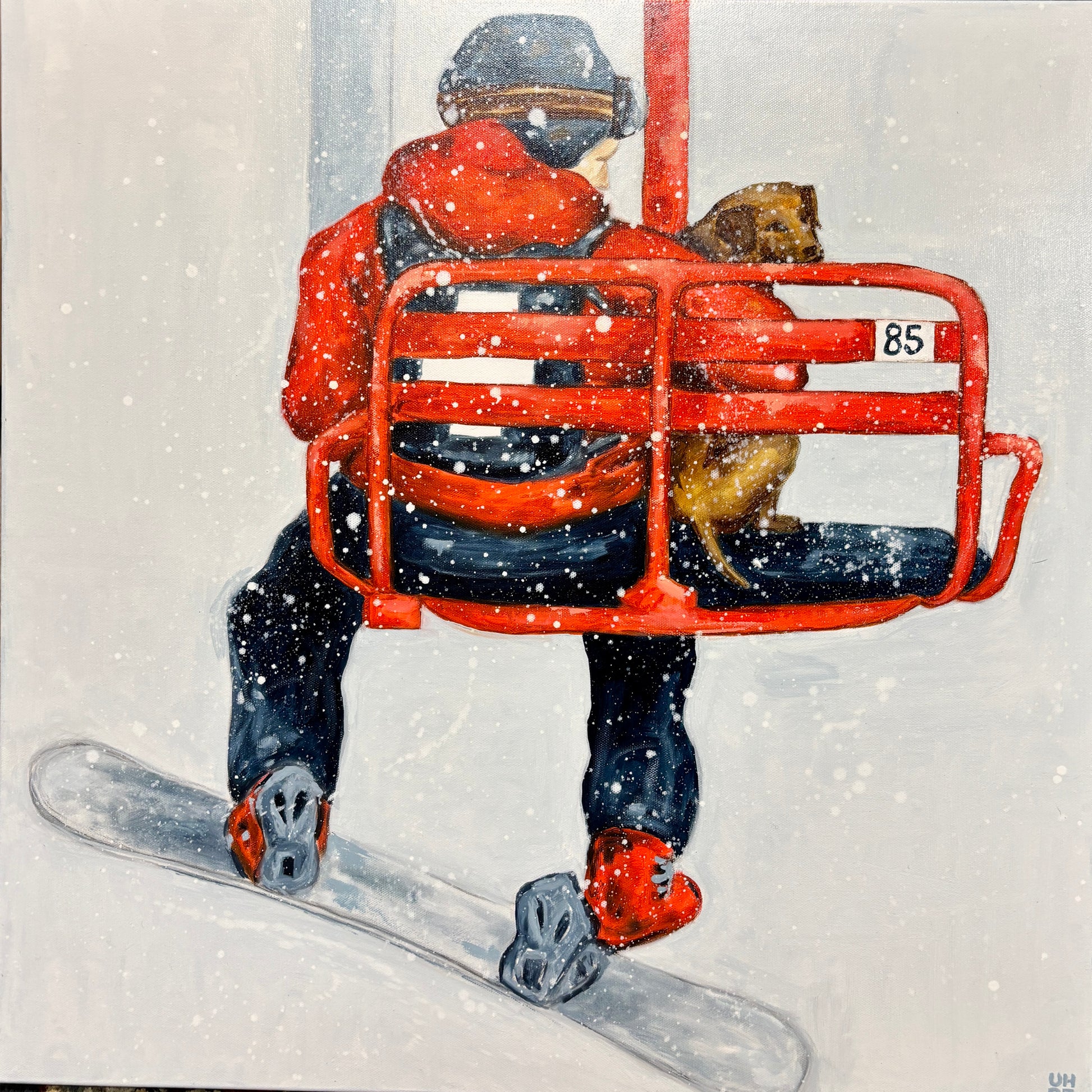 Embrace the thrill of the slopes with "Snowboard Patrol" by Hannah Uhde. This stunning oil painting captures the bond between man and his furry companion as they conquer the mountains together. Featuring a classic Bridger Bowl red ski chair, this piece celebrates the excitement of snowboarding and the loyalty of our canine companions.