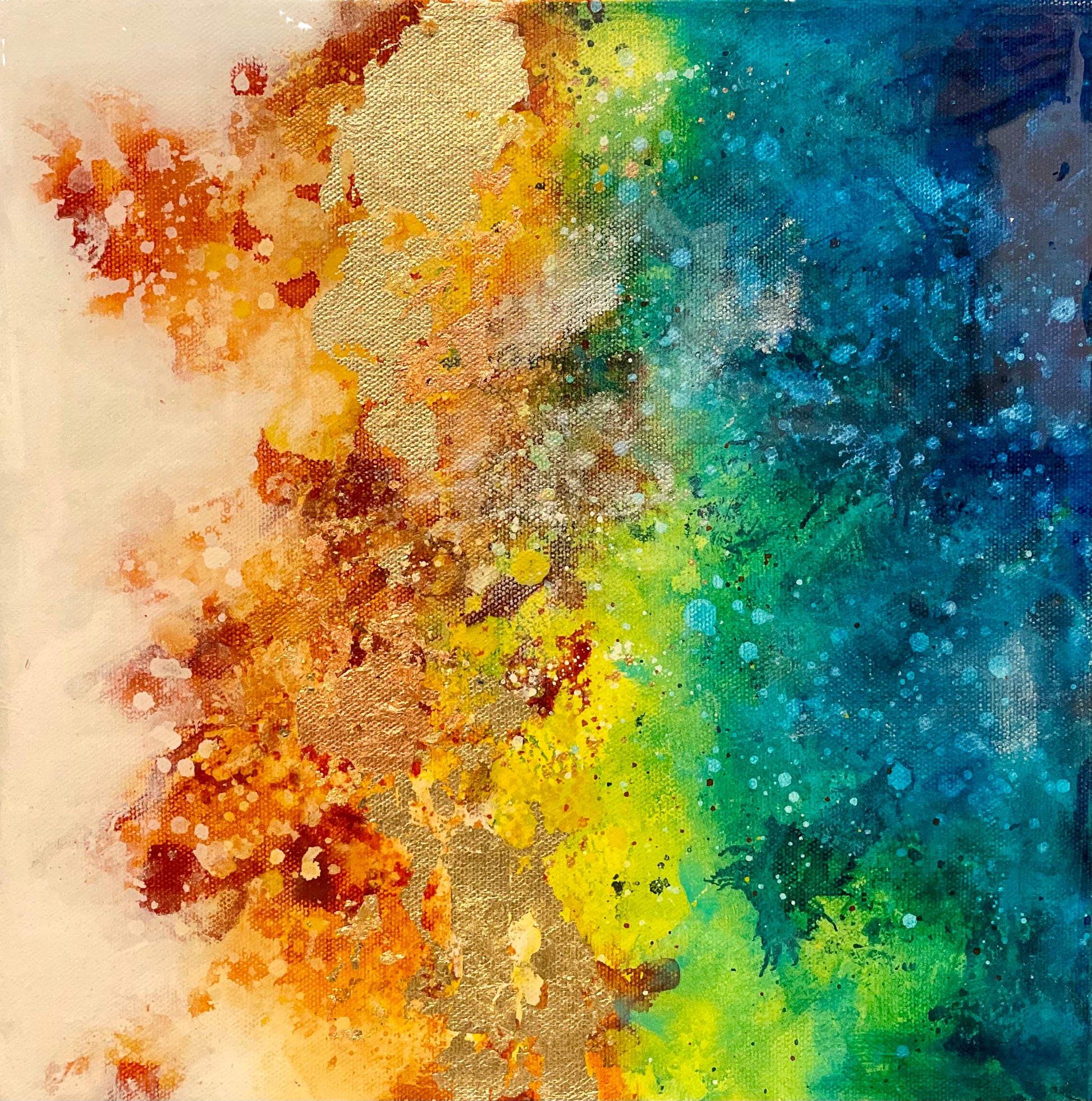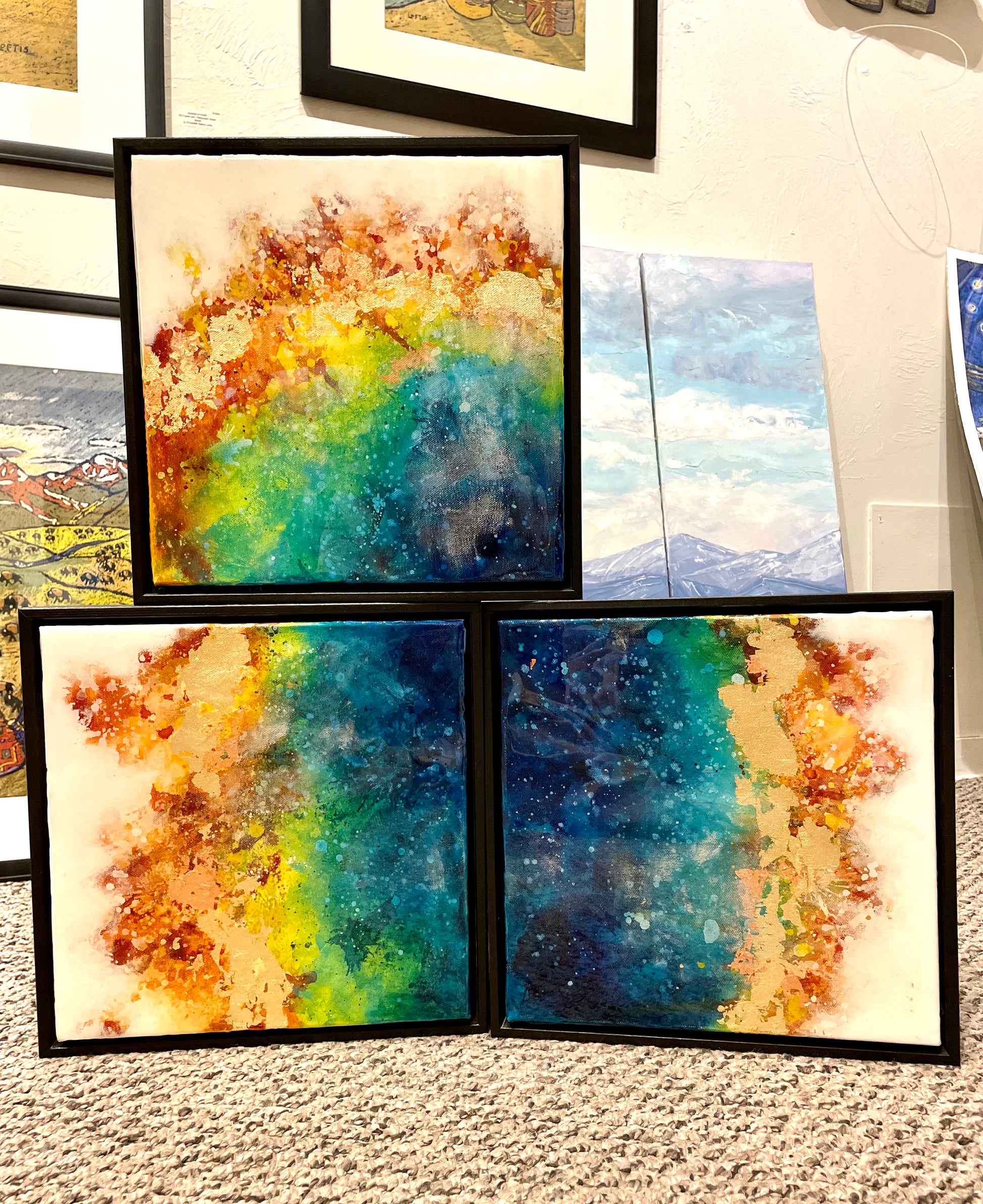 Bring the beauty of Yellowstone into your home with Grand Prismatic Abstracts by LeeAnn Ramey. This beautiful 12"x12" mixed media piece showcases the vibrant colors of the Grand Prismatic Thermal Pool, allowing the majesty of Yellowstone to live forever in your home. Acrylic, gold and copper leaf, silver dust and epoxy resin finish. Signed on the back so you can display in any direction.
