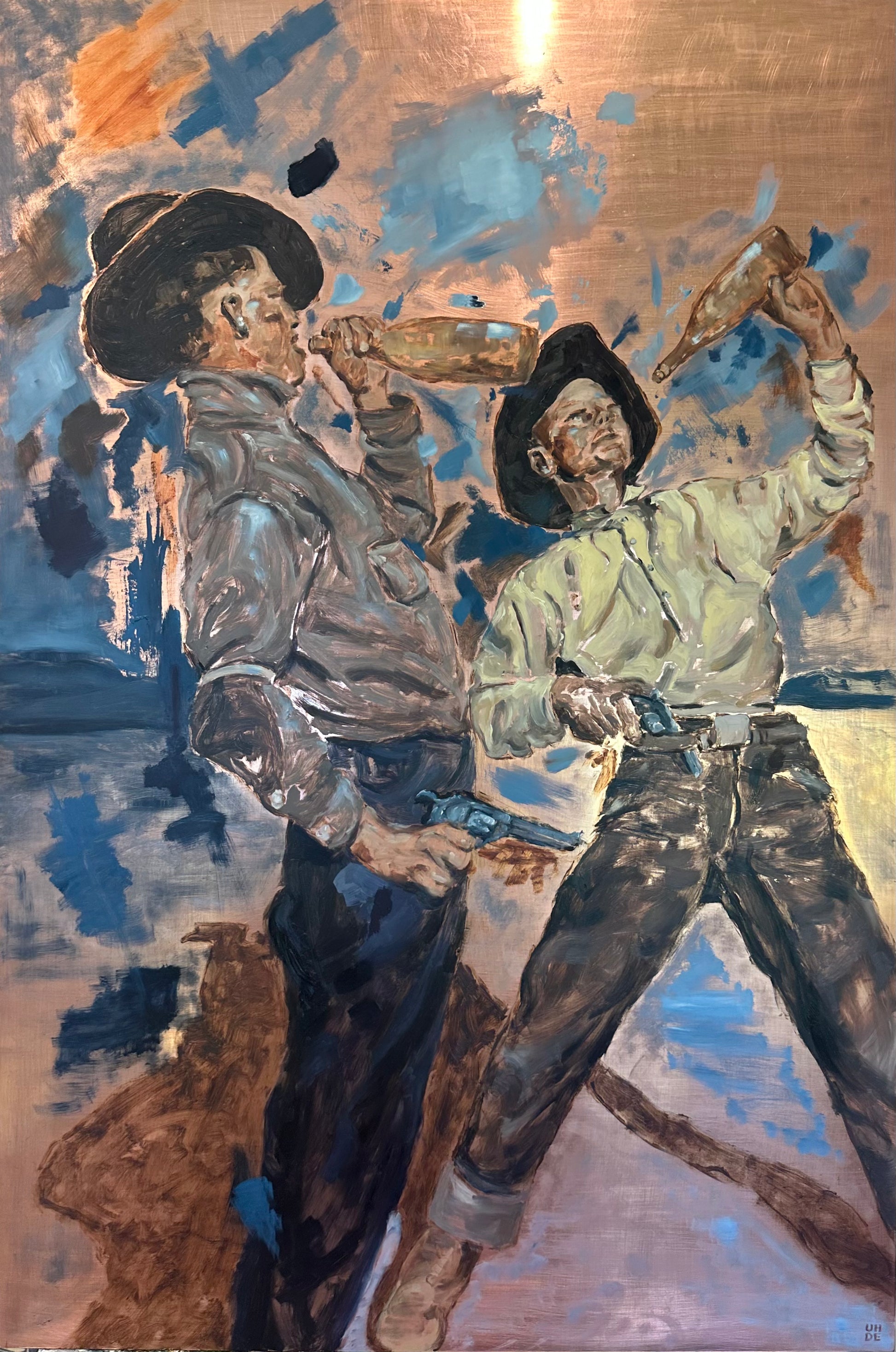 This playful artwork is painted from one of Hannah's old b/w family photos and features a rowdy gathering of cowboys sharing good times under Western skies, rendered in moody blues and rustic earth tones.
