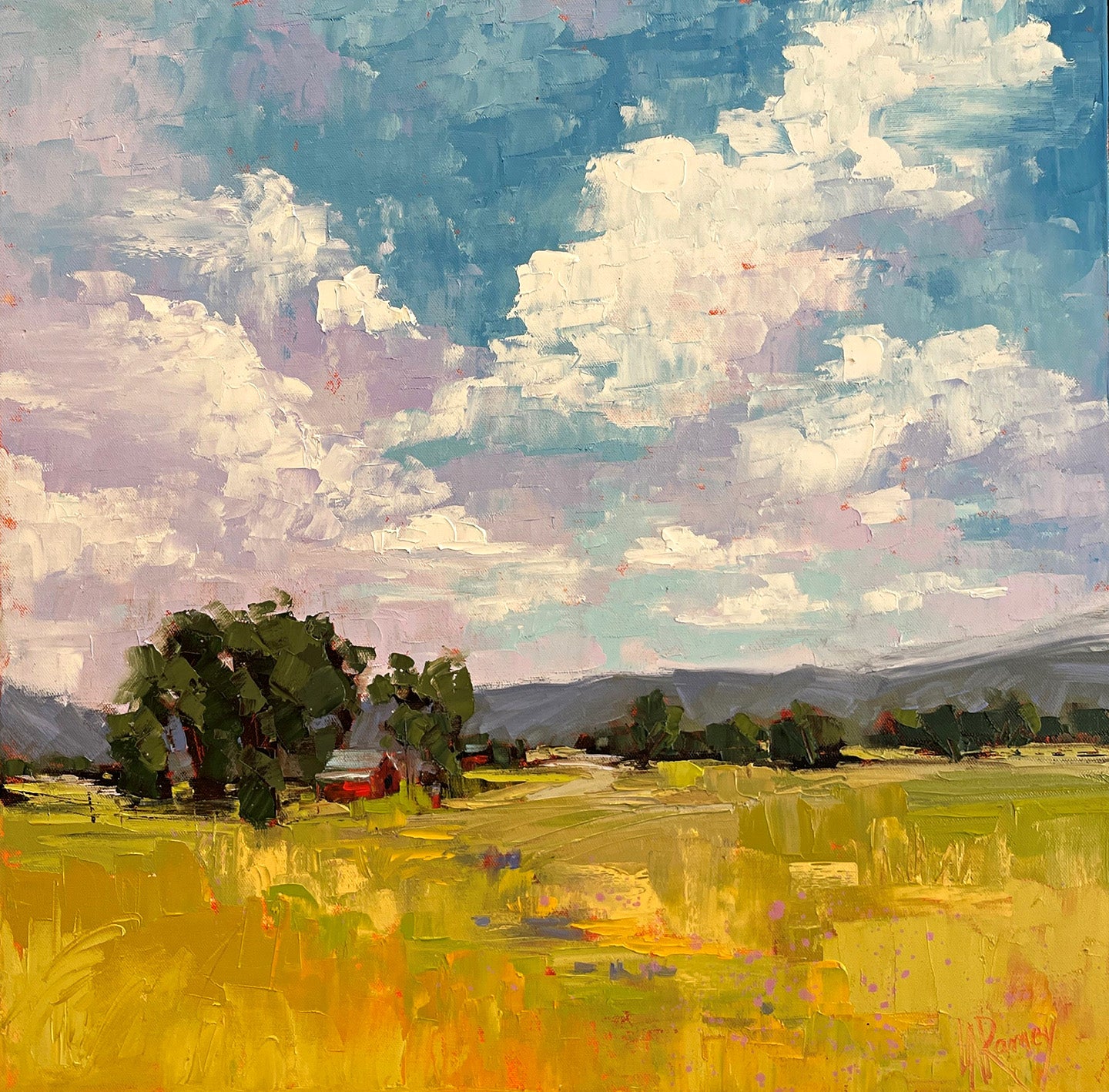 This painting won 2nd Place in "Plein Air on the Yellowstone" in August of 2023 and is now available for print orders. It was painted on a gorgeous late summer day, and captures the amazing clouds and landscape of Paradise Valley, MT. Painted with a palette knife with bold colors and thick paint, this piece exhibits great texture and gestural marks that entertain the eye through the beautiful fields and sky, leading to the lovely red barn.