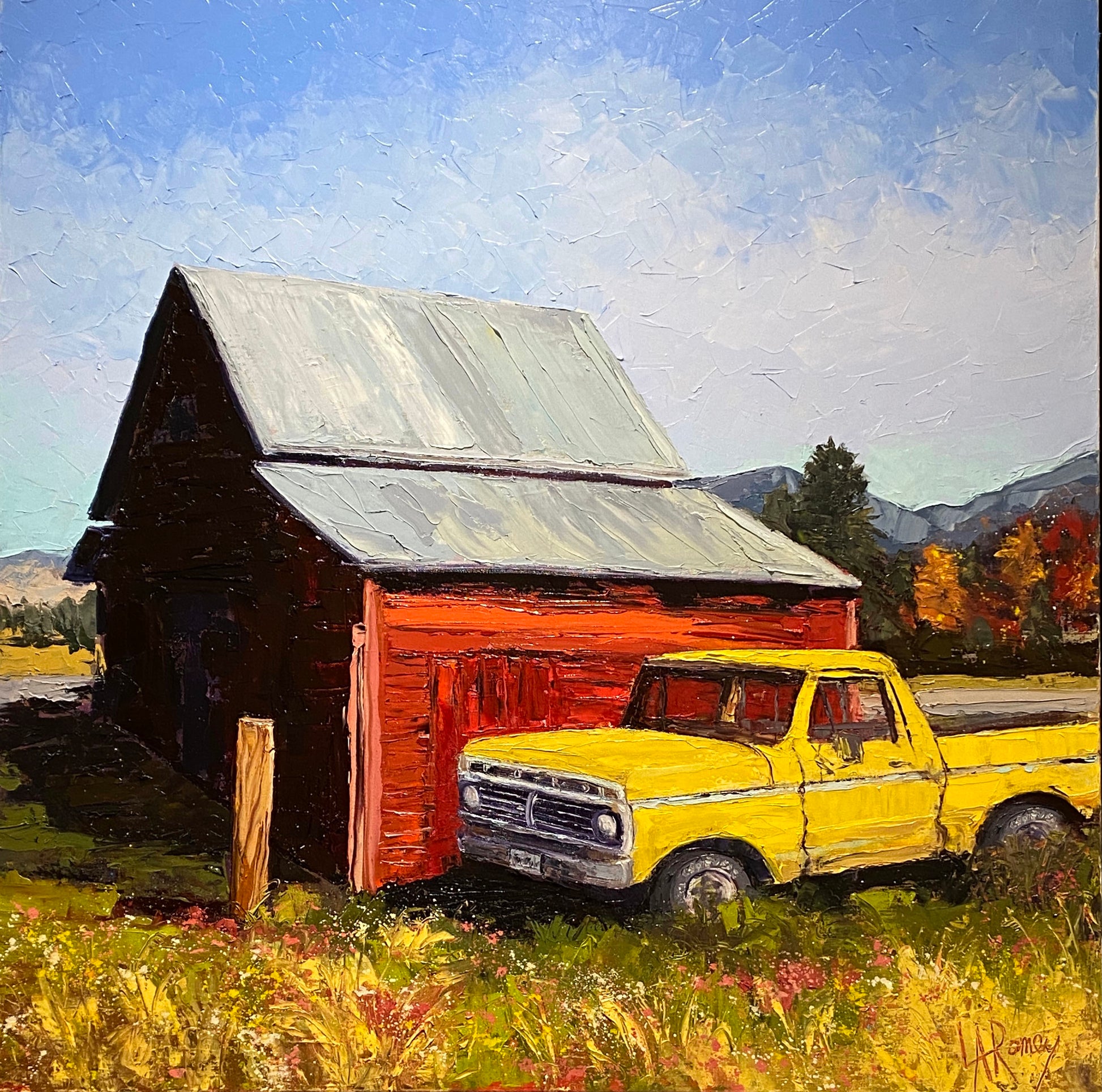 "Old but not Forgotten" is a beautiful depiction of a classic yellow Ford truck and old red barn, nestled in the backdrop of the mountains of Story Mill in Bozeman, Montana. Vibrant reds, blues and yellows transport you to the nostalgia of a summer in the Western landscape. An ideal piece to bring a taste of the countryside into your home. Printed on archival quality canvas in a black floater frame and ready to hang, this framed canvas print makes a great gift, or perfect to remember your travels to the west!