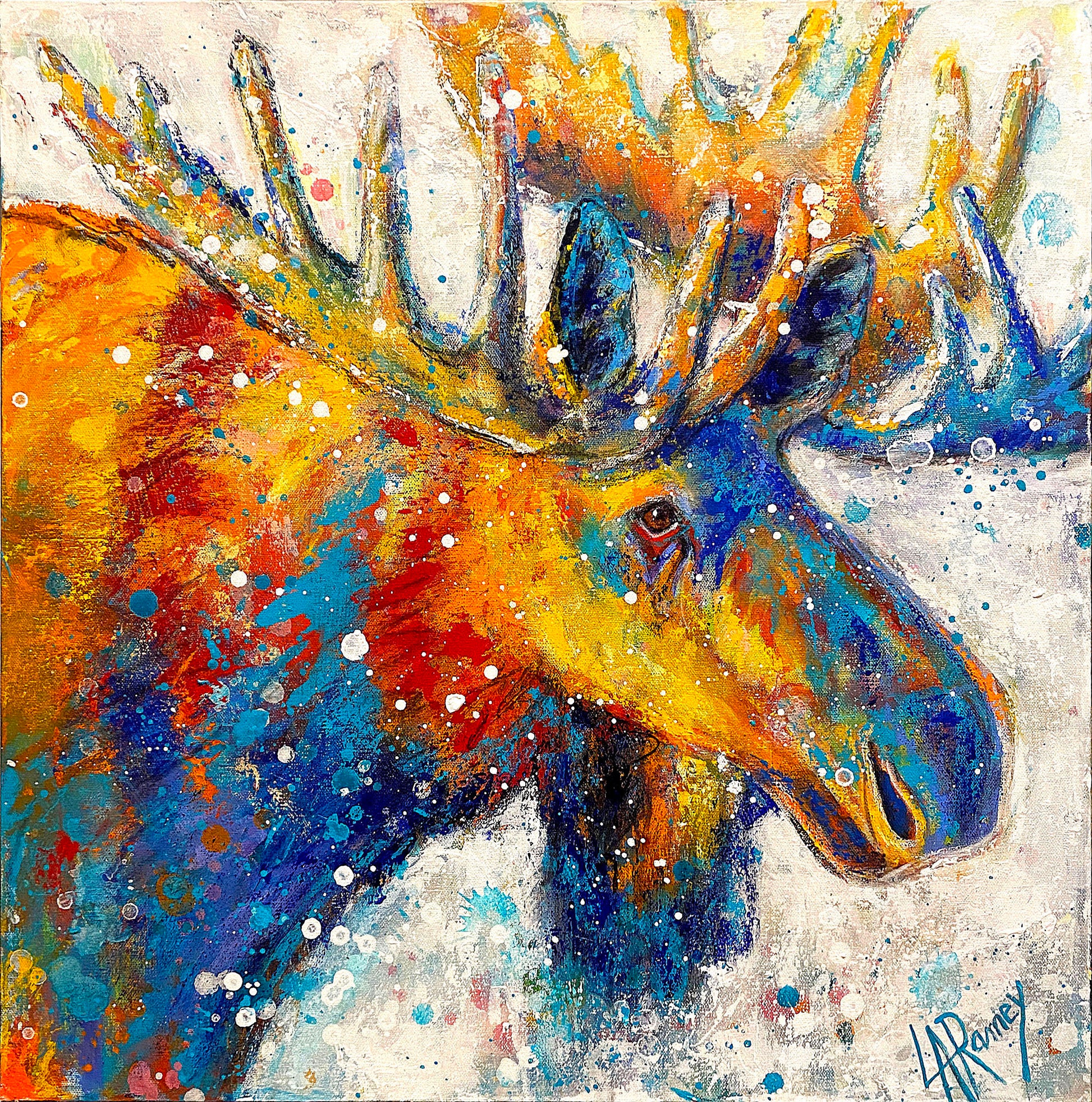 This bold and beautiful "Snowy Moose" framed canvas print is the perfect way to bring a touch of wildlife to your home. This bright, colorful artwork is sure to bring a fun, cheerful atmosphere to any room. Printed on archival quality canvas in a black floater frame and ready to hang. Makes a great gift, or perfect to remember your travels to the west!