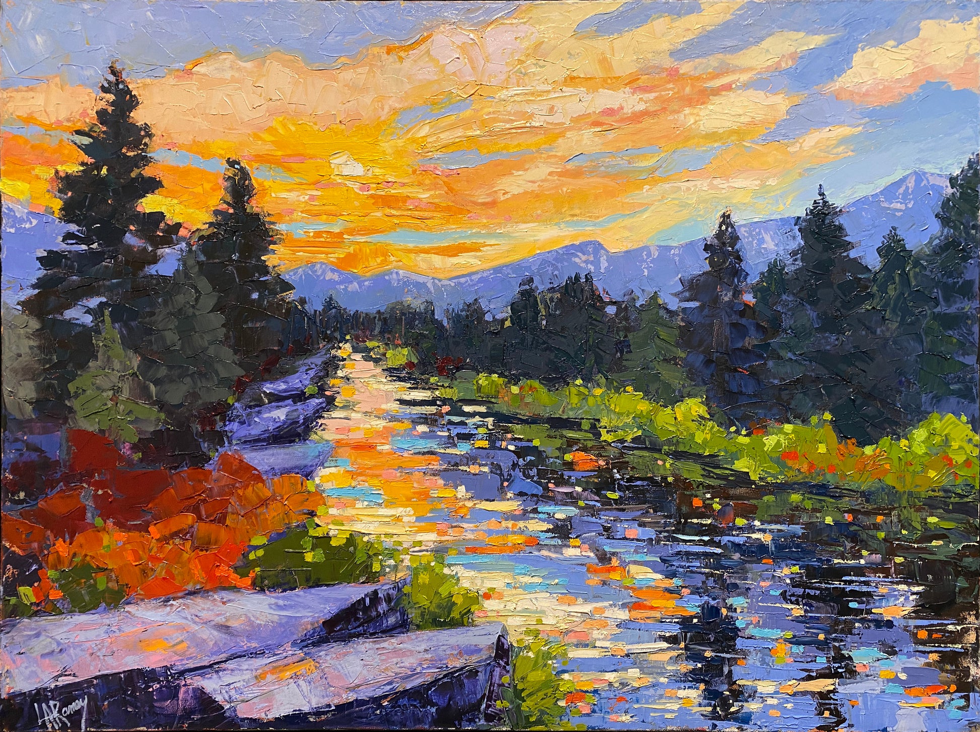 Experience the beauty of a Montana sunset with "Sunset on the Gallatin." This captivating landscape captures the reflections of the sunset, river, trees, and rocks for a vibrant and expressive riverscape. With its richly textured, colorful and contemporary style, this piece will bring a unique energy to any room. Printed on archival quality canvas in a black floater frame and ready to hang, this framed canvas print makes a great gift, or perfect to remember your travels to the west!
