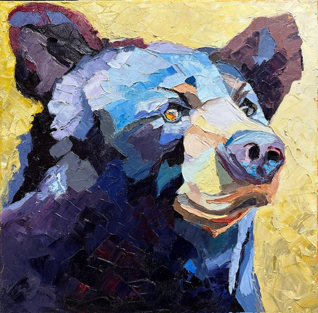 A whimsical bear emerges from dreamy brushstrokes, where soft blues and purples dance together in perfect harmony. This painterly piece captures a moment of gentle wonder, inviting you to get lost in its artistic charm and soothing color palette.